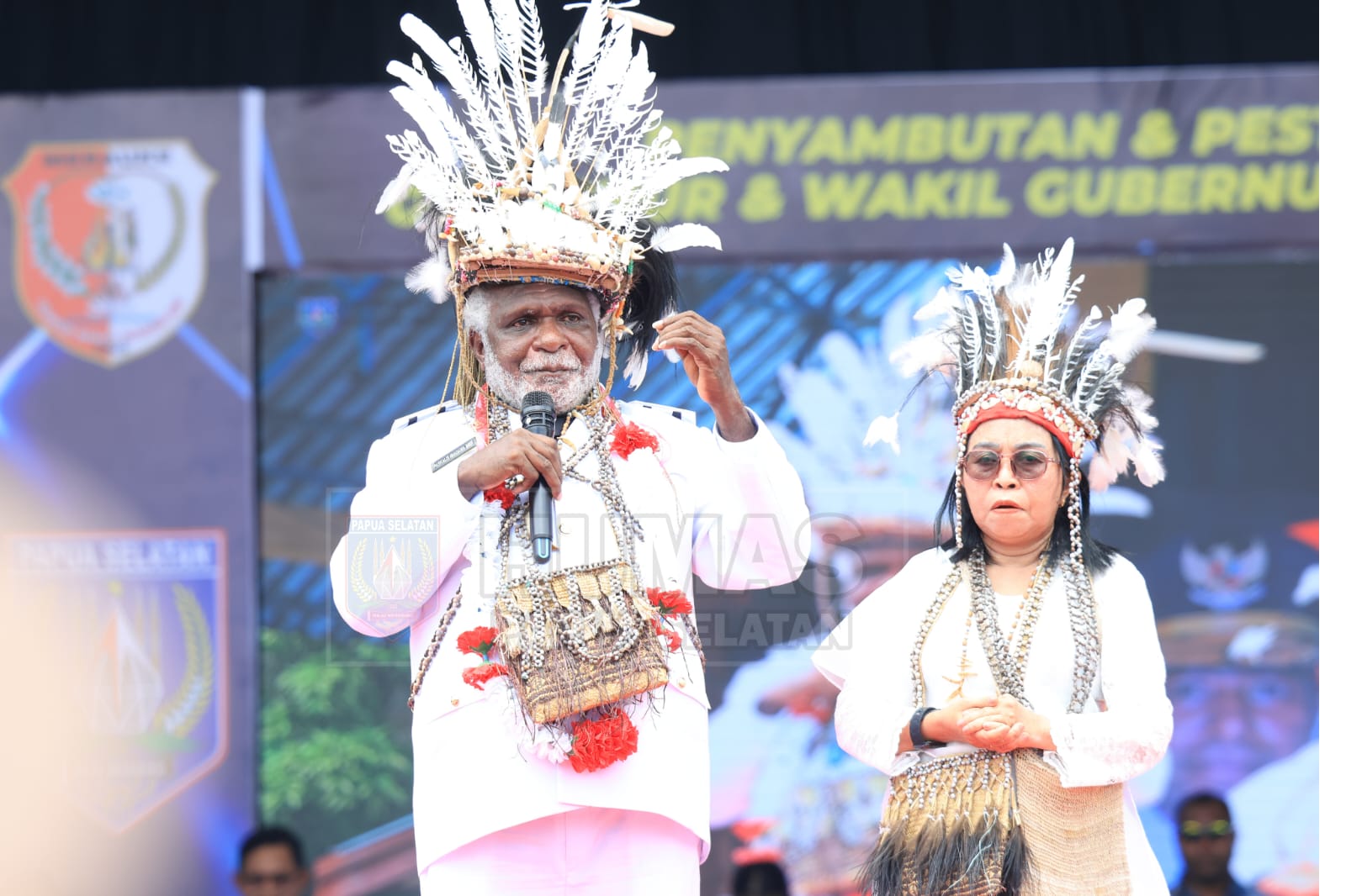 Gubernur Papua Selatan Apolo Safanpo didampingi istri saat menyampaikan orasi di hadapan ribuan warga yang menyambut kedatangannya bersama Wakil Gubernur Paskalis Imadawa di Lapangan Mandala, Merauke, Selasa (04/03/2025). (Foto: ist)