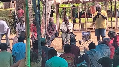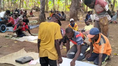 Tim Pemetaan-Advokasi dan Tim Ekonomi BUMMA Kanum membuat sketsa peta wilayah adat di sela kegiatan menoken Suku Kanun di Kampung Wereaver, District Morehead, Western Province, PNG, 6 September 2025. (Foto: Papuainside.id/Makawaru da Cunha)