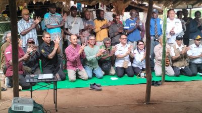 Pemangku kepentingan menunjukkan salam menoken di Kampung Sota, Distrik Sota, Kabupaten Merauke, 1 September 2025. (Foto: Papuainside.id/Makawaru da Cunha)