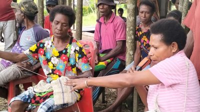 Dua Perajut Noken Kampung Ampas, Yani Mofus dan Catharina Yoron, menunjukan cara merajut noken di sela-sela kegiatan Menoken Mambesak di Kampung Ampas, Distrik Waris, Kabupaten Keerom, Provinsi Papua 6-7 Agustus 2024 lalu. (Foto: Makawaru da Cunha/Papuainside.id)