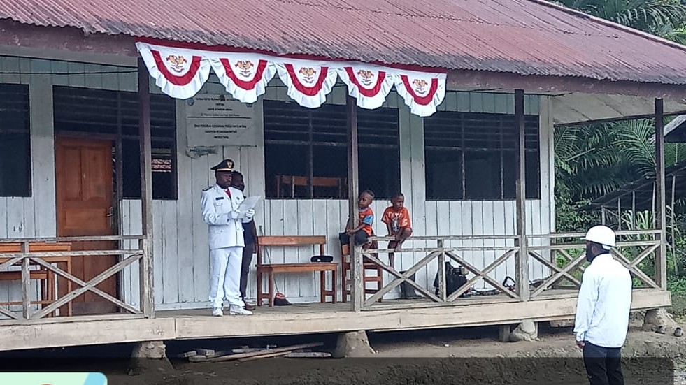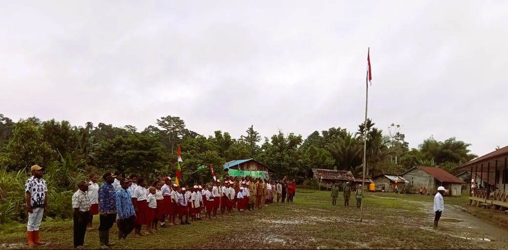 Meskipun berada jauh dari kota dan pusat keramaian namun tidak menyurutkan semangat Kepala Distrik Boas Saunggay S.P bersama warganya menggelar upacara bendera mengibarkan bendera Merah Putih dan membacakan teks proklamasi.