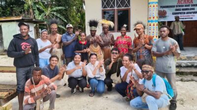 Perwakilan Mitra BUMMA, BUMMA PT Yombe Namblong Nggua dan Komunitas Menoken Membumi Membumma berfoto bersama Ketua DAS Namblong Bernard Demotekay, menyampaikan SALAM MENOKEN sebagai simbol penghormatan dan kebersamaan masyarakat adat. (Foto: Papuainside.id/Makawaru da Cunha)