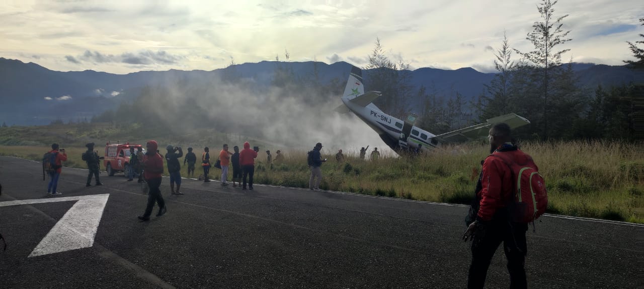 PAPUAINSIDE.ID, ILAGA— Penumpang bersama crew pesawat Smart Air PK-SNJ dalam kondisi selamat ketika pesawat berpenumpang 15 orang ini tergelincir keluar dari landasan saat mendarat di Bandara Aminggaru, Ilaga, Puncak, Papua Tengah, Senin (05/02/2024).