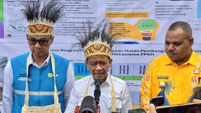 Menteri ESDM, Bahlil Lahadalia (tengah) didampingi Direktur Utama PLN, Darmawan Prasodjo (kiri), dan Bupati Supiori, Heronimus Mansoben (kanan) saat sesi doorstop bersama media di sela kunjungan kerja di Kabupaten Supiori, Papua, Jumat (25/7/2025). (Foto: PLN UIW Papua dan Papua Barat)