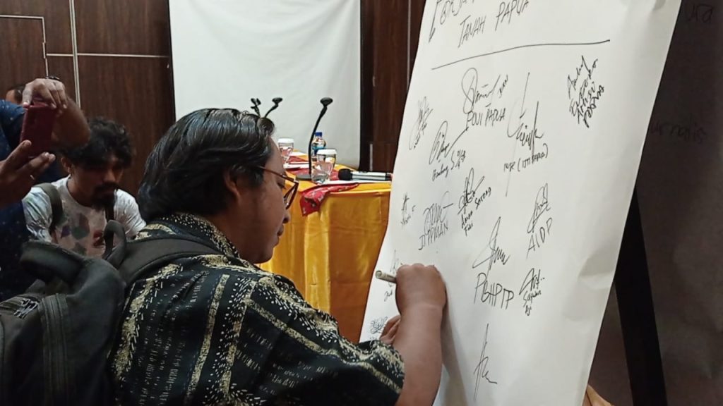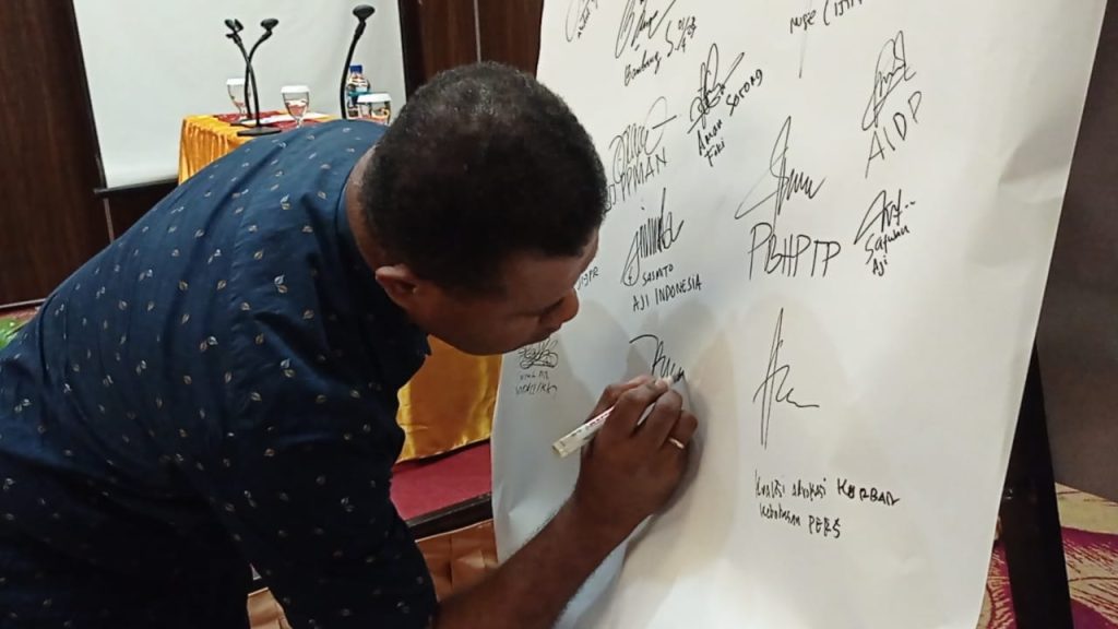 Penandatanganan kesepakatan bersama para peserta kegiatan. (Foto: Dok/AJI Jayapura)