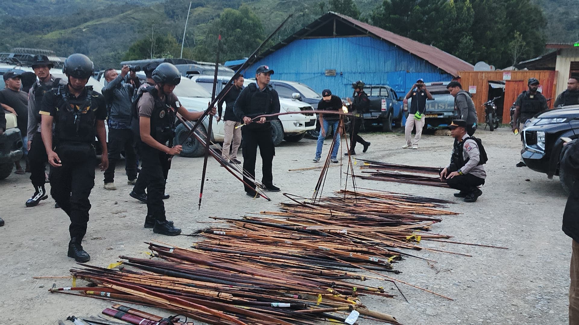Dipimpin langsung LO Papua Pegunungan Kombes Pol Andi Yoseph Enoch, didampingi Kapolres Tolikara Kompol Irianto John, razia fokus pada benda tajam yang dibawa massa pendukung paslon bupati dan wakil bupati Tolikara.