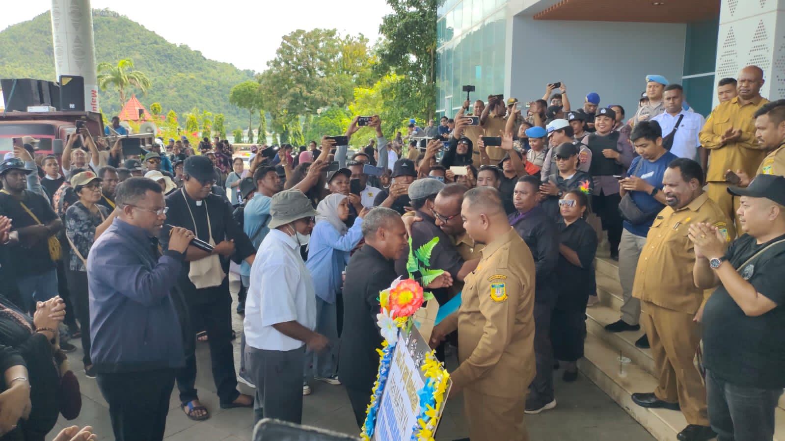 Sementara itu, Pdt. Christian Abaa, Ketua Klasis GKI Keerom, menambahkan bahwa kebenaran merupakan dasar moral yang harus ditegakkan. Ia menyebut penyerahan krans bunga sebagai simbol matinya demokrasi di Tanah Papua jika tidak dijaga dengan baik.