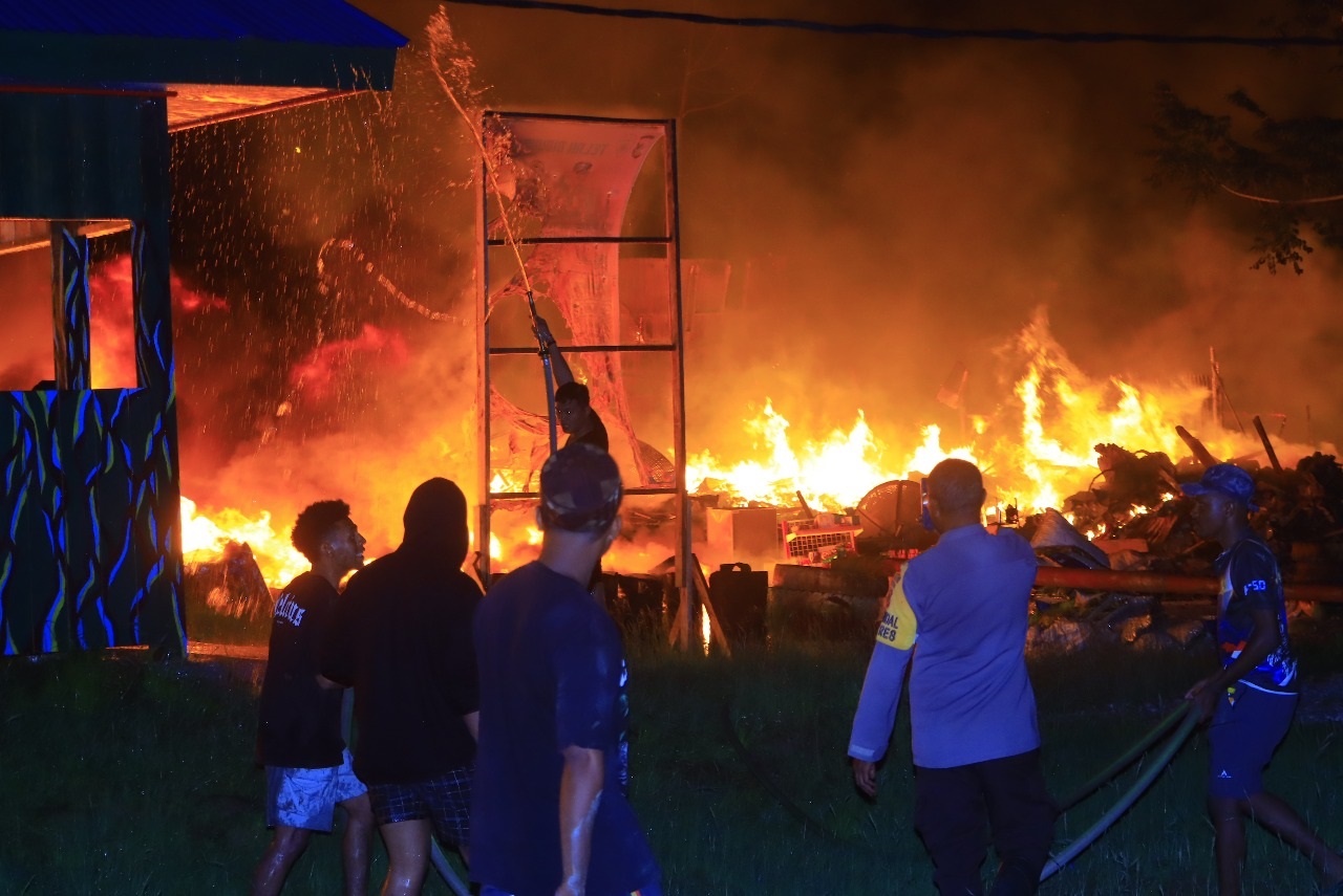 “Setelah menerima laporan, Pos Penjagaan merespon dan memeriksa lokasi kejadian. Anggota Polres Yalimo kemudian mencari bantuan alkon untuk mengatasi api yang sudah mulai membesar dan merambat ke toko lainnya,” ujarnya.
