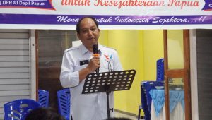 Ketua DPW Partai Perindo Papua dr. Raflus Doranggi, MM, menyampaikan sambutan, ketika pembukaan Posko Pemenangan ERANTA-MAPAN di Kawasan Ruko Tanjakan Otonom-Skyland, Kota Jayapura, Papua, Rabu (6/12/2023). (Foto: Makawaru da Cunha/Papuainside.id)