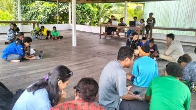 Menoken Laptop Microsoft Word, untuk Nokeners di Kampung Abar, Distrik Ebungfau, Kabupaten Jayapura, Provinsi Papua, Jumat (4/4/2025). (Foto: Makawaru da Cunha/Papuainside.id)
