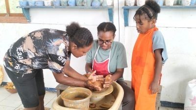 Beatriks Felle, salah seorang anggota dan pelatih Kelompok Gerabah Tradisional Titian Hidup Kampung Abar, menunjuk cara membuat gerabah menggunakan mesin meja putar modern. (Foto: Dok/Papuainside.id)