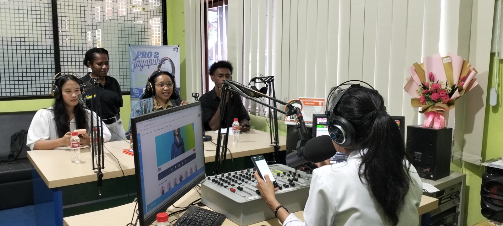 Empat peserta pelatihan potensial yakni Jeklinda Abigail, Rosalina Karoba Agatha Yenusi, dan Ariel Rafel Mariai, mengikuti pelatihan Kokarya Studentpreneurship berbagi cerita tentang giat usaha anak muda Papua di RRI Jayapura.  (Foto: Corcom PT Freeport Indonesia)