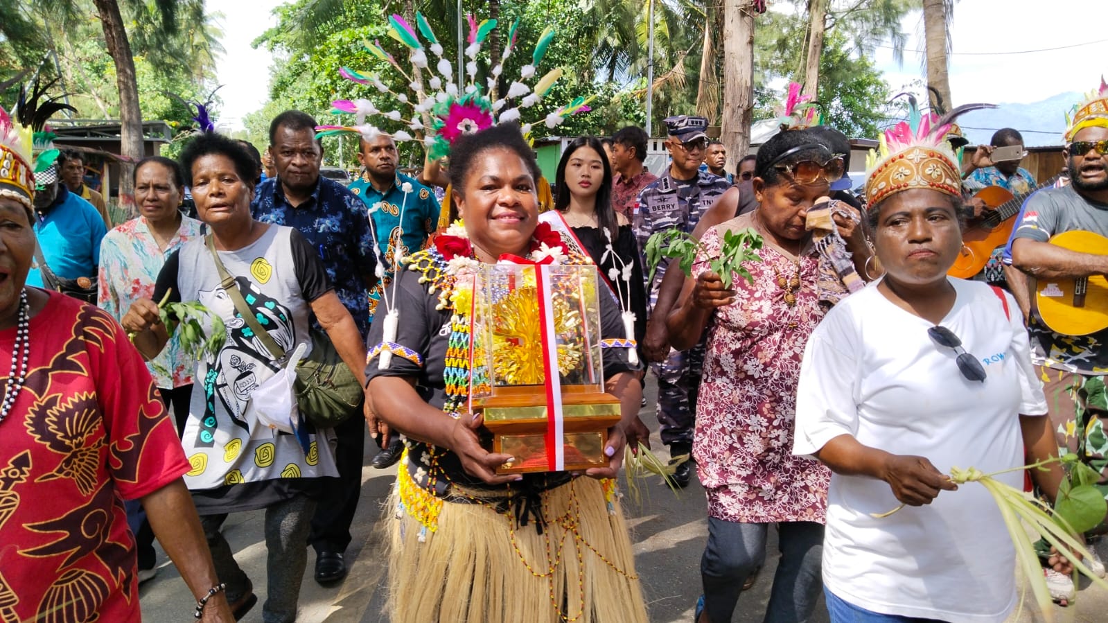 Mama Nela, sapaan akrab Petronela Merauje tiba di Bandara Sentani pada Sabtu (10/6) pagi yang kemudian diarak menuju Pantai Cibery.