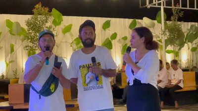 Pencipta Jingle Kaka Besar Manyala, Julio Faot didampingi Pembawa Acara, saat Launching Jingle Kaka Besar Manyala di Esge Park Kompleks RM Sendok Garpu, Kotaraja, Abepura, Kota Jayapura, Provinsi Papua, Minggu (14/7/2024) malam. (Foto: Makawaru da Cunha/Papuainside.id)