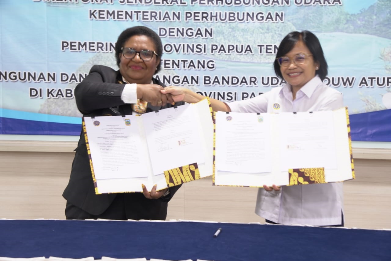MoU ditandatangani Penjabat Gubernur Papua Tengah, Dr Ribka Haluk, SSos, MM dan Dirjen Perhubungan Udara Kemenhub RI, Maria Kristi Endah Murni di Kantor Kemenhub RI, Jakarta, Kamis (13/6/2024).