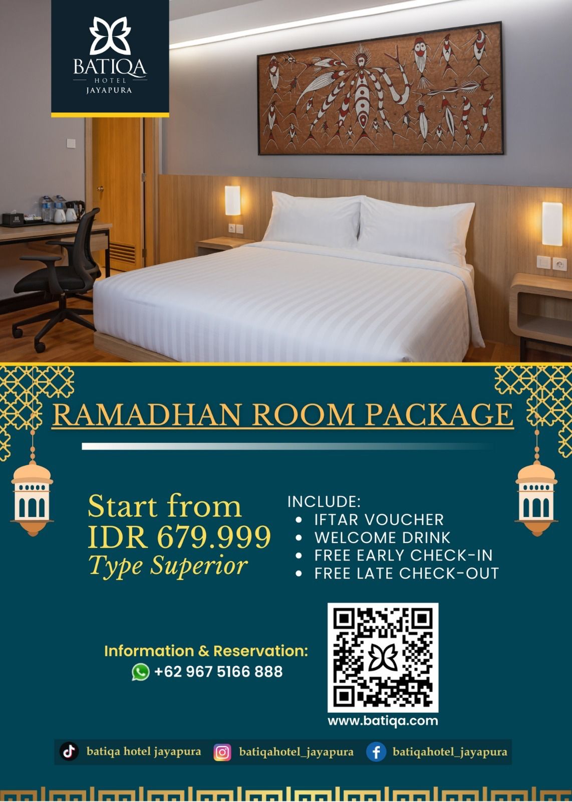 Rofa Raka menambahkan, untuk paket menginap, Batiqa Hotel Jayapura menawarkan harga mulai dari Rp 679,999. Harga ini sudah termasuk menginap di kamar superior, voucher untuk buka puasa, gratis check-in lebih awal, dan gratis check-out lebih lama.