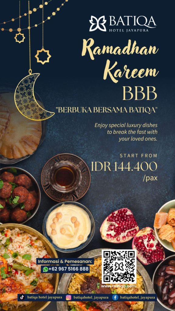 “Untuk para tamu yang ingin menikmati menu berbuka puasa di Batiqa Hotel Jayapura dapat mengunjungi Fresqa Bistro yang buka setiap hari selama bulan Ramadhan. Menu berbuka puasa tersedia mulai pukul 17.30 hingga 19.30 WIT. Dan untuk paket menginap bisa dipesan melalui website kami ataupun menghubungi langsung ke Batiqa Hotel Jayapura,” tutup Rofa Raka.