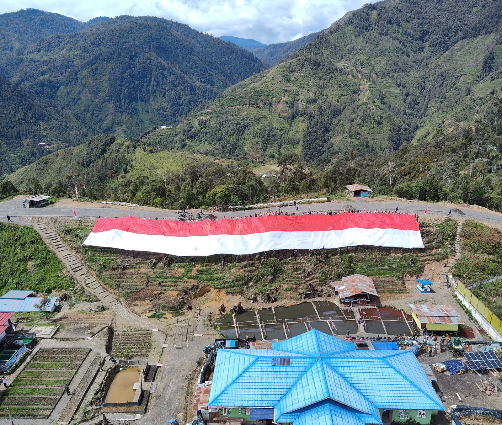 Bendera Merah Putih raksasa ukuran 100x 7 meter berkibar di Sugapa Intan Jaya merayakan HUT-78 RI. (foto: Satgas Yonif 330/Tri Dharma)