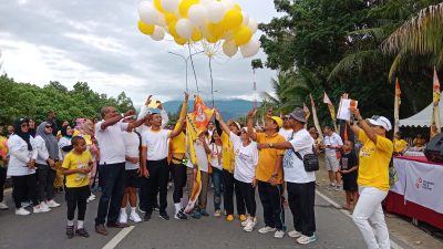 Ketua Tim Kerja Paulus Waterpauw, Nasarudin Sili Luli, didampingi Relawan, melepas balon gas ke udara di sela-sela kegiatan Senam Manyala Bersama Mace For PW di Car Free Day Jalan Holtekamp, Kota Jayapura, Sabtu (20/7/2024) pagi. (Foto: Makawaru da Cunha/Papuainside.id)