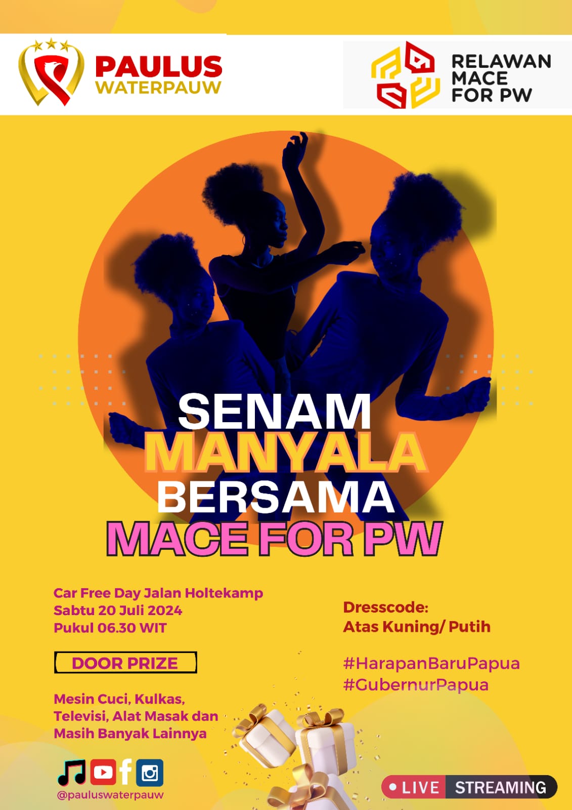 PAPUAINSIDE.ID, JAYAPURA—Relawan MACE PAPUA for PW (Paulus Waterpauw) mengajak masyarakat Kota dan Kabupaten Jayapura dan sekitarnya bergabung untuk Senam Manyala Bersama MACE for PW.