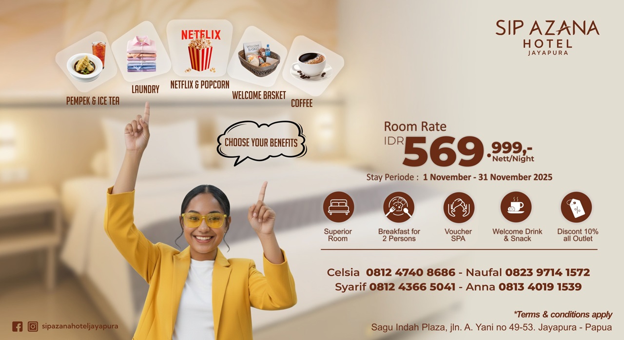 “Melalui program ini, kami berharap dapat memberikan nilai tambah bagi para tamu serta memperkuat posisi SIP Azana Hotel Jayapura sebagai hotel pilihan yang menawarkan kenyamanan, kualitas layanan, dan pengalaman menginap terbaik di Jayapura,” tambah Adnan melalui Siaran Pers, Sabtu (8/11/2025).