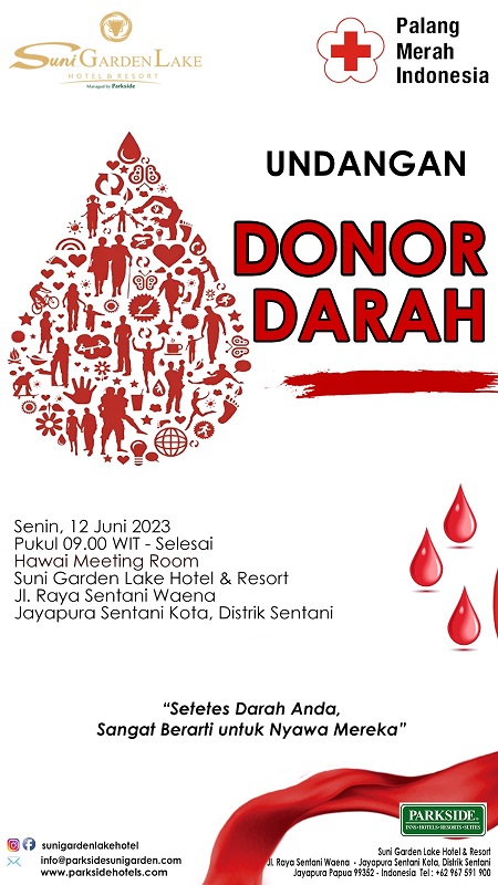 Mari daftarkan dirimu menjadi pahlawan bagi sesama dengan mendonorkan darahmu. Informasi lebih lengkap dan pendaftaran dapat melalui media sosial Instagram @sunigardenlakehotel atau via telepon di 0967 591 900 dan Whats App di 0821 9150 0800 atau melalui 0852 8402 8414. **