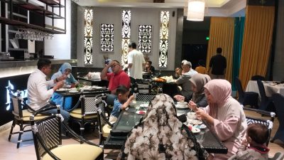 Tamu sedang menyantap menu bukber di hari pertama Bulan Suci Ramadhan di Braza Sky Lounge, Rooftop, Lantai 11, Sabtu (1/3/2025) petang. (Foto: Makawaru da Cunha/Papuainside.id)