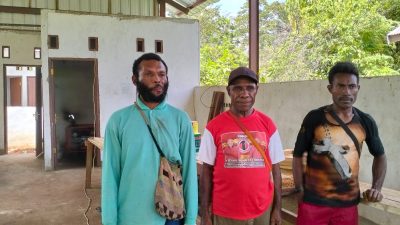 Koordinator The Samdhana Institute Papua Piter Roki Aloisius, didampingi Koordinator Usaha Mebel Masyarakat Adat Koperasi “Kumea” Kampung Ampas, Urbanus Manggo, dan tukang Ernap Nof, Sabtu (8/3/2025). (Foto: Makawaru da Cunha/Papuainside.id)