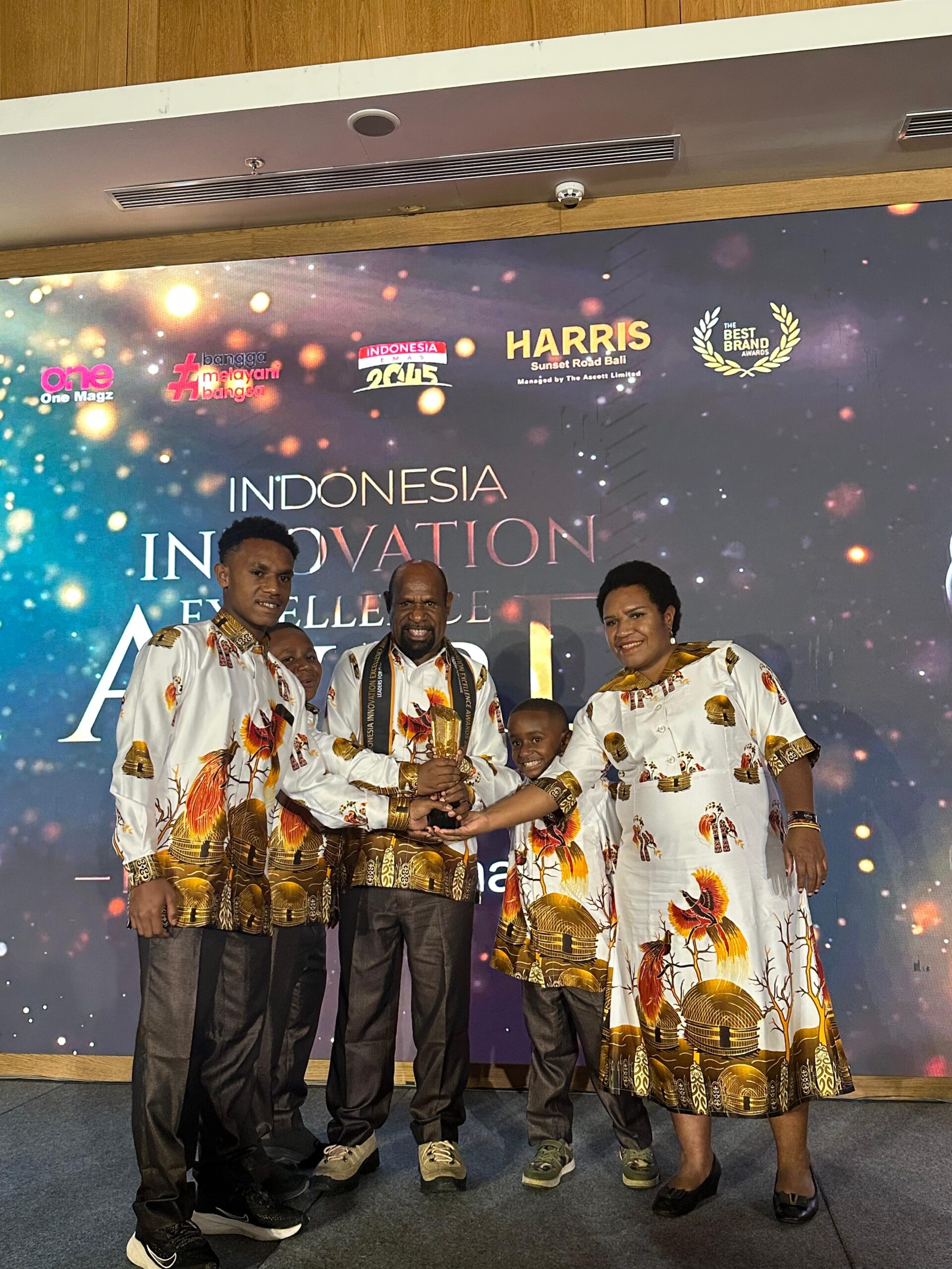 Wakil Bupati Mamberamo Tengah Itaman Thago, didampingi istri Selvia Polona Thago serta anak-anak, menerima penghargaan Indonesia Innovation Excellence Award 2026 pada malam penganugerahan di Denpasar, Bali, Jumat (23/1/2026). (Foto: Istimewa)