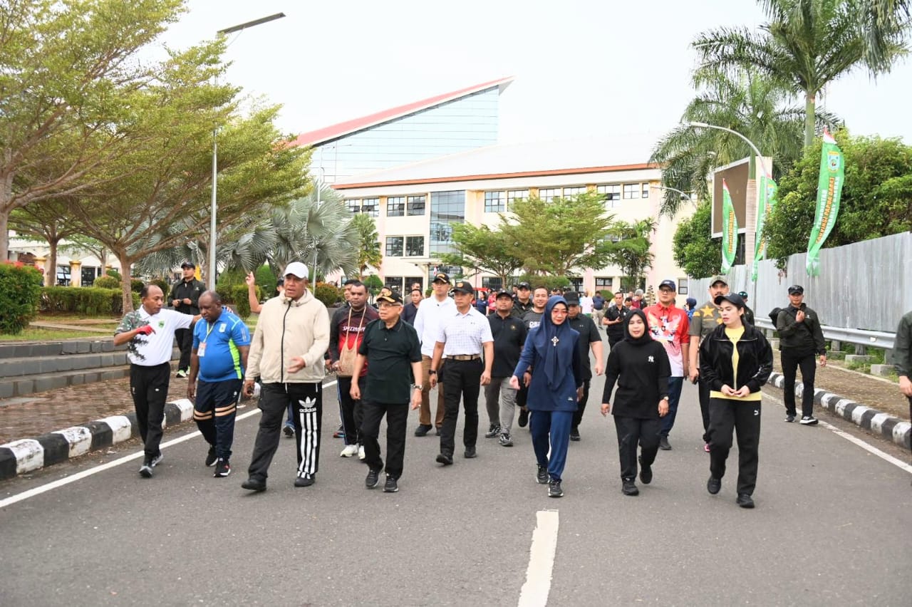 Olahraga diawali dengan pemanasan lalu berjalan kaki mengitari kompleks Kantor Gubernur Arfai.